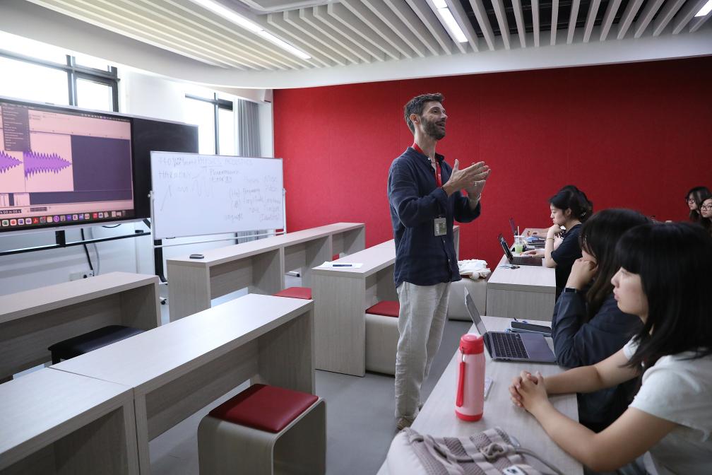 9月25日,海南陵水黎安国际教育创新试验区中央民族大学海南国际学院的外籍教师在给学生上音乐技术与作曲课。新华社记者 郑悦 摄