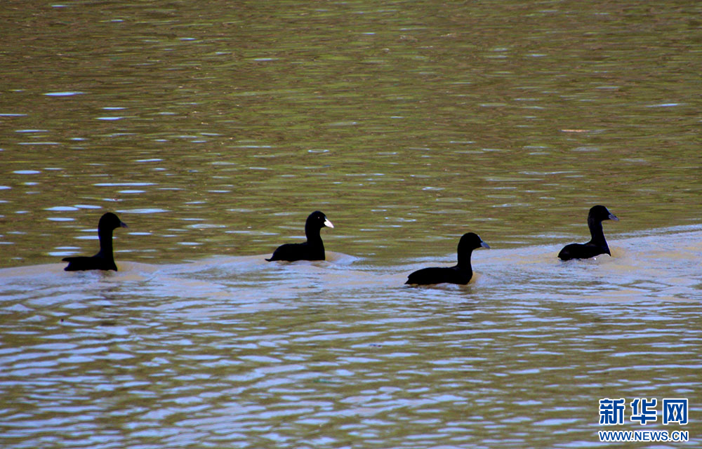 十堰市郧阳湖国家湿地公园,骨顶鸡在湖面游动。新华网发 曹忠宏摄
