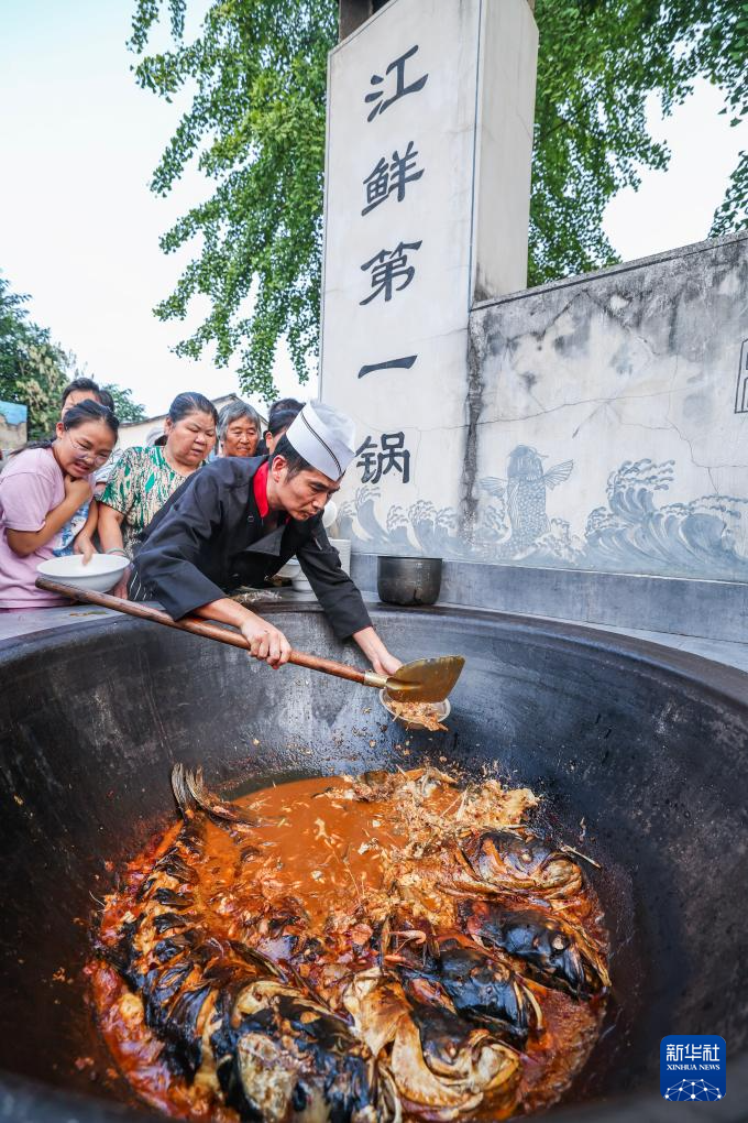 9月29日,富春江江鲜大会的主打项目“江鲜第一锅”开锅,厨师给游客分发锅中炖煮的江鲜。“江鲜第一锅”是在直径1.5米的大铁锅中炖煮上百斤的江鲜鲢鱼,香气四溢。