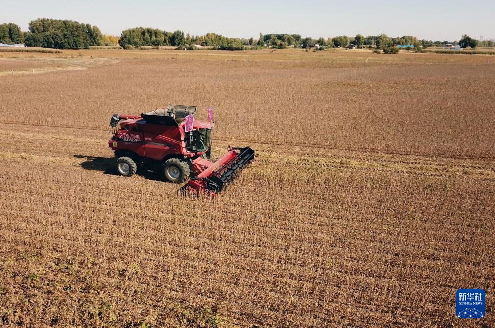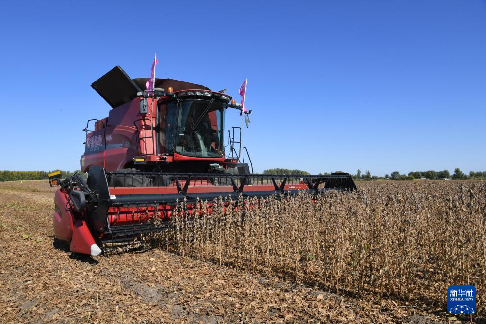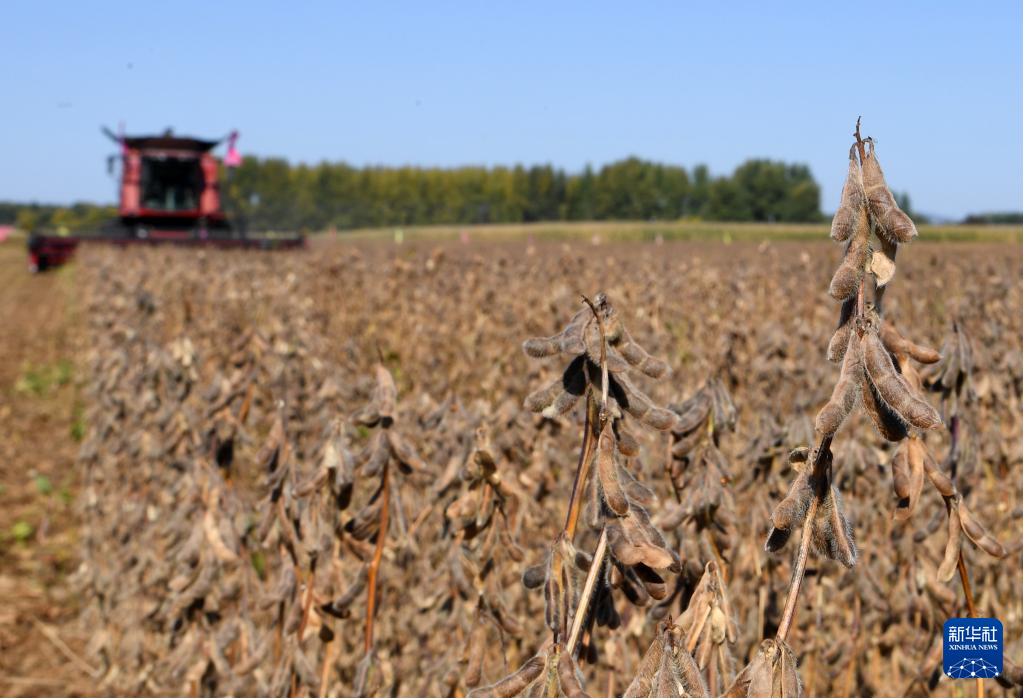 9月29日,在内蒙古自治区兴安盟扎赉特旗音德尔镇,大型机械在收获大豆。