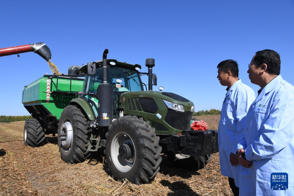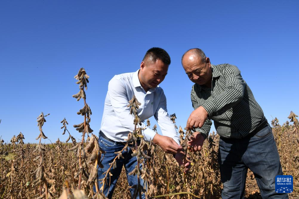 9月29日,在内蒙古自治区兴安盟扎赉特旗音德尔镇,扎赉特旗雨之润农牧业专业合作社负责人朱振宇(右)和中国种子集团技术人员在田间查看即将收获的大豆。