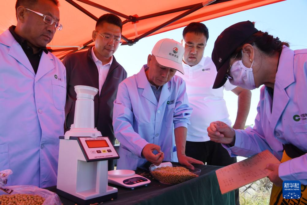 9月29日,在内蒙古自治区兴安盟扎赉特旗音德尔镇“中联豆1505”实收测产会现场,测产专家组成员在测定刚收获的大豆水分。