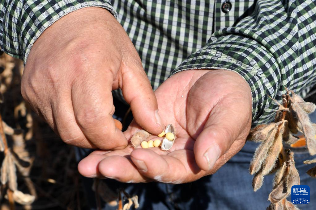 9月29日,在内蒙古自治区兴安盟扎赉特旗音德尔镇,扎赉特旗雨之润农牧业专业合作社工作人员查看即将收获的大豆品质。