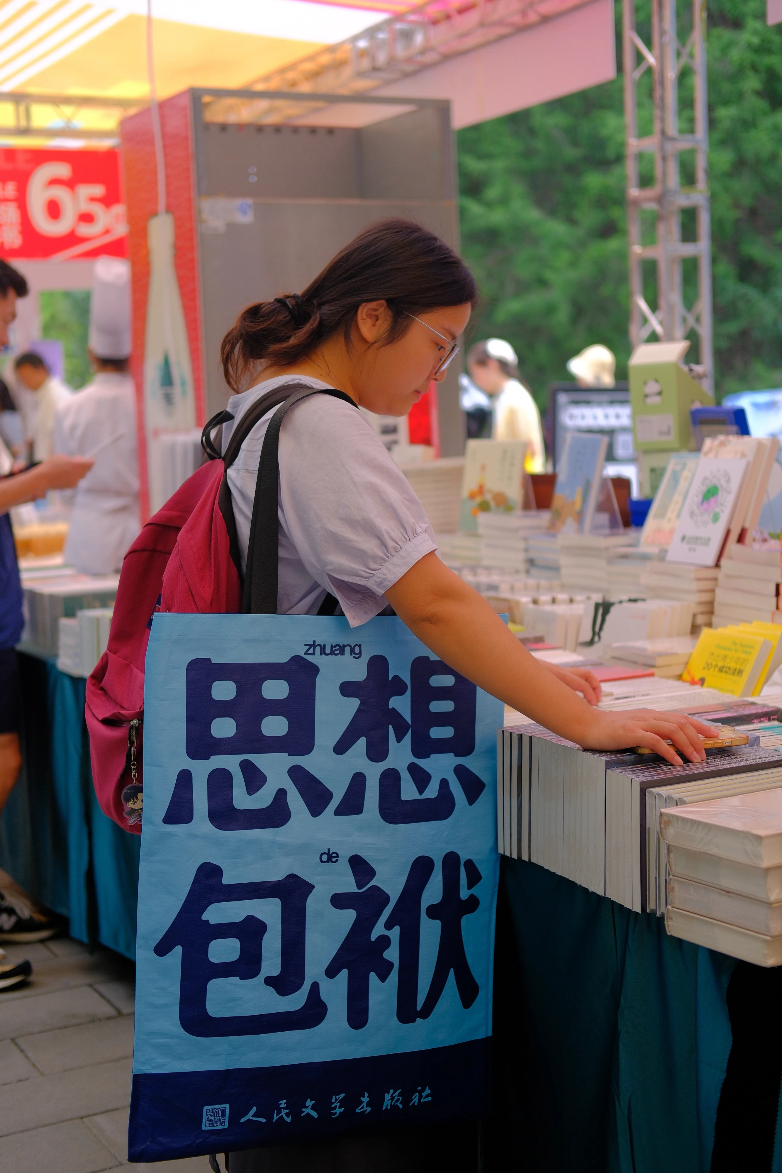 每年书市,总有不少书迷拖着拉杆箱“大买特买”。今年,作为文创产品中的“热门选手”,各种“包”和“包袱”在地坛的园子里异常火爆。