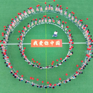 9月28日,江苏省泰州市姜堰区东桥小学教育集团东板桥校区学生学唱爱国歌曲,迎接国庆节(无人机照片)。