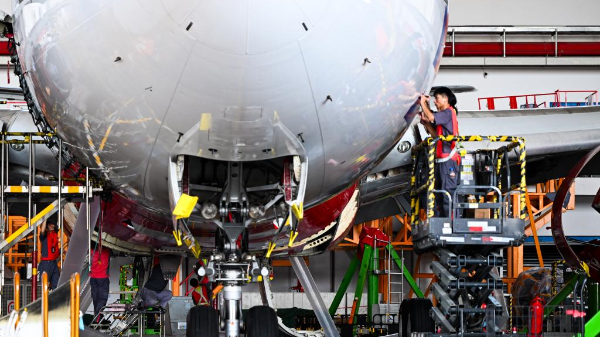 近日,记者跟随“活力中国调研行”采访团走进海南自贸港一站式飞机维修产业基地,亲身感受了这一航空维修领域新兴高地的蓬勃生机。临近“十一”黄金周,飞机大修定检机库内一派繁忙景象,工作人员正紧锣密鼓地对来自泰国、越南等地的航空公司的十余架飞机进行检修。