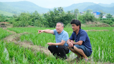 盛夏时节,嫩绿的稻苗在一碧如洗的天空下摇曳,阡陌小径贯穿稻田,形成一幅如诗如画的耕种画卷。广西壮族自治区全州县东山瑶族乡白竹村村民唐增亮拨开稻苗,一旁的驻村第一书记莫日发叮嘱道:“今年也要记得使用农家肥,高残留农药可过不了检。”