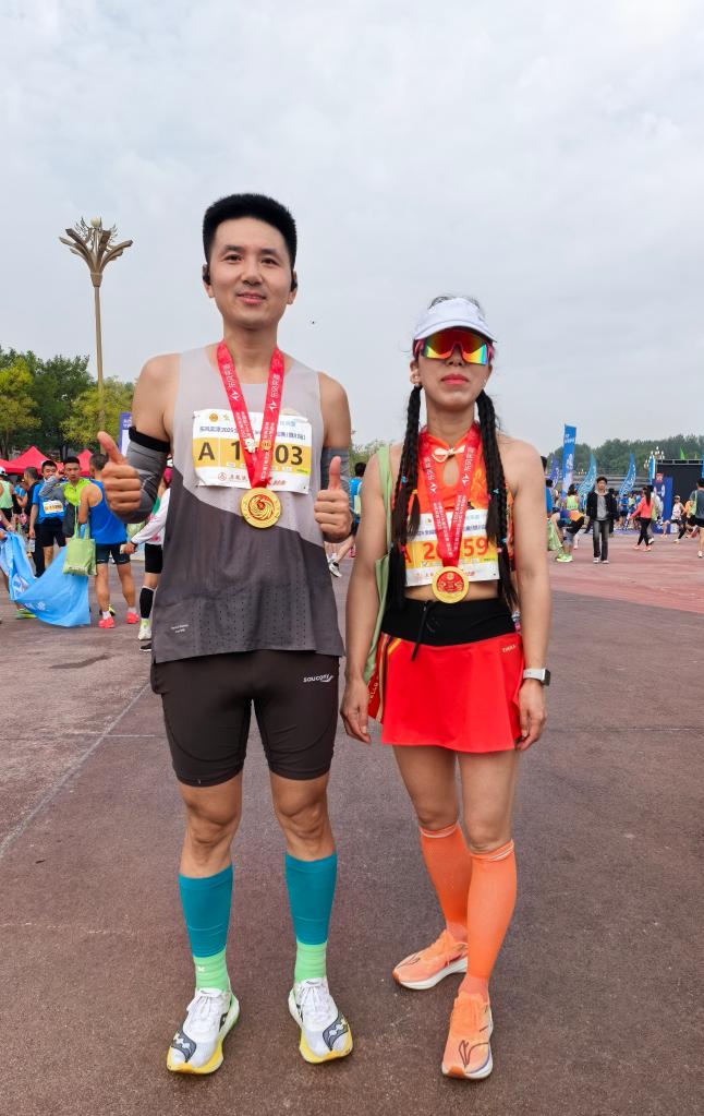 47岁的广东跑者孙丹(左)与宁夏跑友合影。