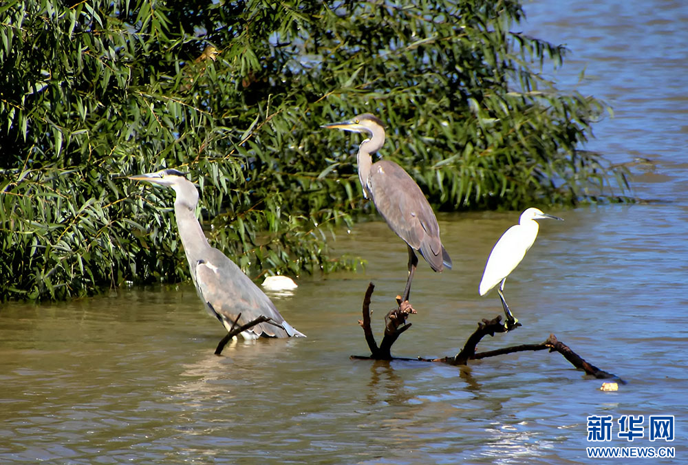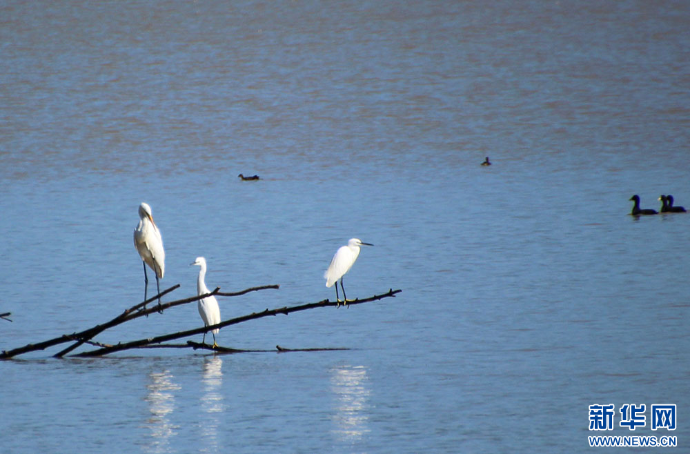 十堰市郧阳湖国家湿地公园,鹭鸟在浅水区觅食。新华网发 曹忠宏摄