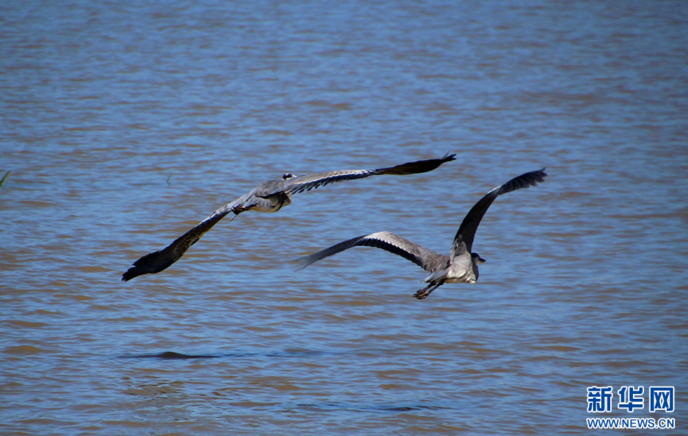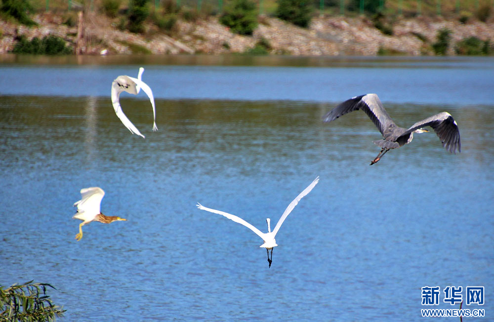 十堰市郧阳湖国家湿地公园,鹭鸟在湖面上飞行。新华网发 曹忠宏摄