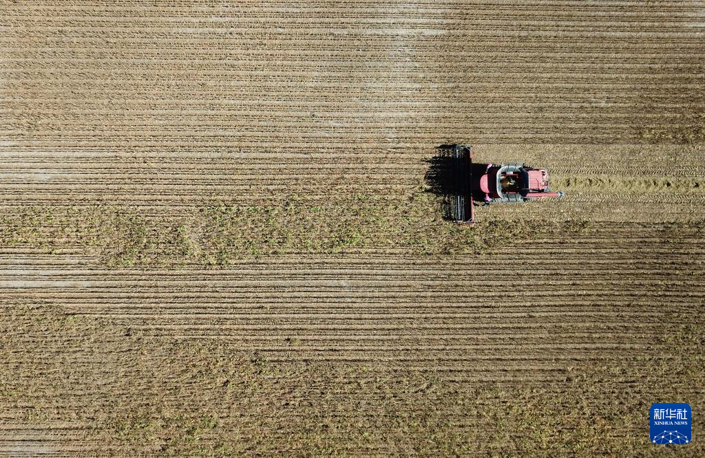 9月29日,在内蒙古自治区兴安盟扎赉特旗音德尔镇,大型机械在收获大豆。