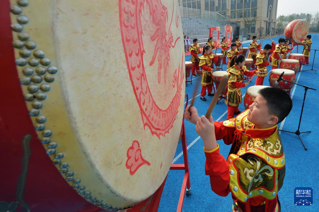 9月29日,在山东省荣成市实验小学,孩子们表演舞龙舞狮。