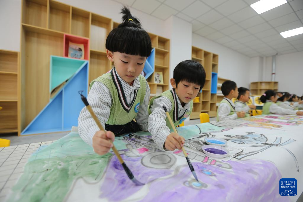 9月28日,甘肃省定西市安定区幼儿园的小朋友在绘制《我爱你中国》长卷。