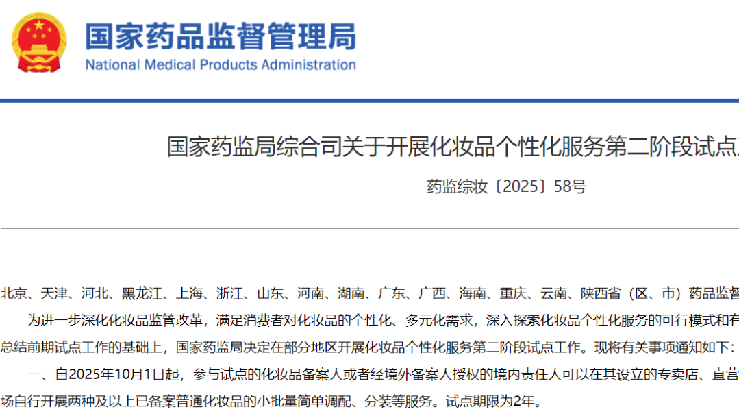 国家药监局综合司关于开展化妆品个性化服务第二阶段试点工作的通知 药监综妆〔2025〕58号