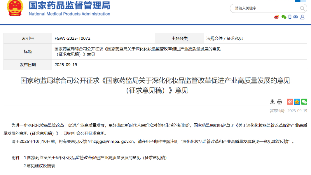 国家药监局综合司公开征求《国家药监局关于深化化妆品监管改革促进产业高质量发展的意见(征求意见稿)》意见