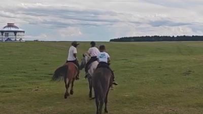 近期,在内蒙古呼伦贝尔市202省道的道乐都驿站附近的草场上,牧民将自己的儿女抱上马背,骑马走向远方。